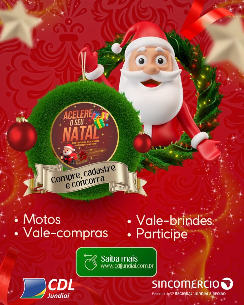 Jundiaí, 24 de dezembro de 2025 – A Campanha ‘Acelere o Seu Natal’, promovida pela Câmara de Dirigentes Lojistas (CDL) e pelo Sindicato do Comércio Varejista de Jundiaí e Região (Sincomercio), termina nesta quarta-feira (24/12).