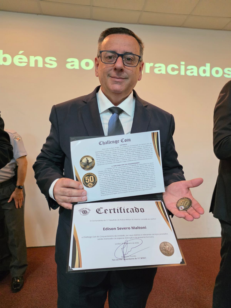 Durante a cerimônia, o presidente da CDL Jundiaí, Edison Maltoni, foi homenageado com o certificado e a Challenge Coin do Cinquentenário da Unidade, reconhecimento concedido a parceiros que contribuem e apoiam o trabalho da corporação.