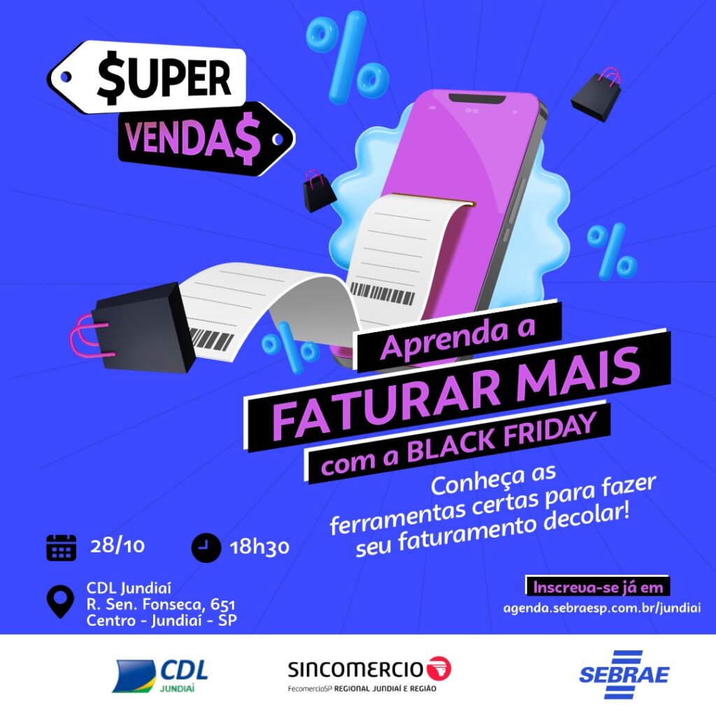A Black Friday está se aproximando e a CDL Jundiaí, em parceria com o Sincomércio e o Sebrae, realiza o workshop “Super Vendas: Aprenda a Faturar Mais com a Black Friday”. O objetivo é capacitar empresários e comerciantes para transformar a data em uma oportunidade de aumentar o faturamento.