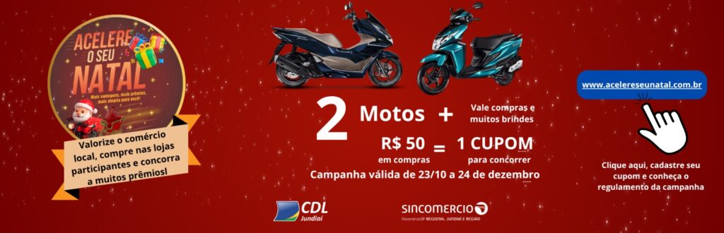 Começou nesta quinta-feira, 23 de outubro, a campanha “Acelere o Seu Natal”, promovida pela CDL Jundiaí e Sincomércio para incentivar as compras no comércio local. A iniciativa segue até o dia 24 de dezembro de 2025 e sorteará dois prêmios principais — duas motos zero quilômetro — além de vales-compra e diversos brindes.